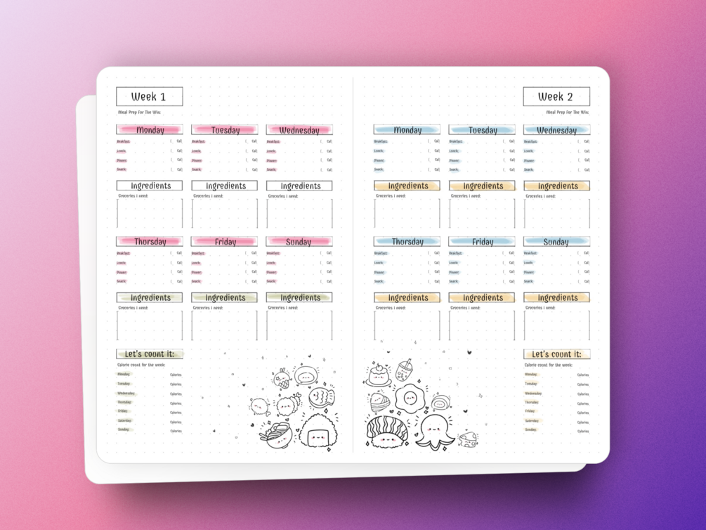 1x preparation spreadsheet, 1x monthly budget, 2x weekly meal planner.